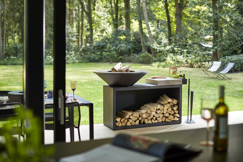 Ce produit tout-en-un combine style indétrônable et fonctionnalité. Il comprend une plaque de cuisson de 85 cm ou 100 cm de diamètre, une vasque, un grand socle pour le stockage des bûches, un solide plan de travail et un bac de rangement utile pour les ustensiles et les condiments. Le plan de travail est disponible en bois de teck ou en céramique de couleur gris anthracite.