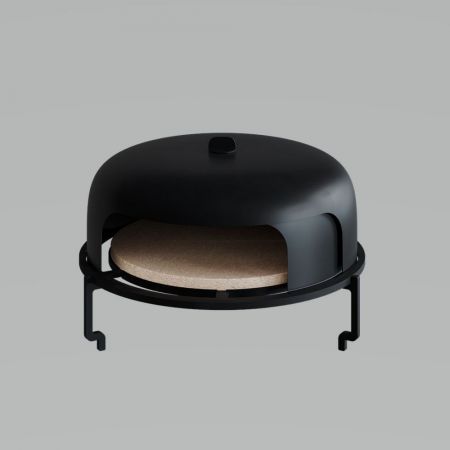 en acier dont l’extérieur peut tourner à l’intérieur. Dans la plaque en fonte, il y a des ouvertures par lesquelles la chaleur du four de l’OFYR peut circuler dans la cloche ce qui permet à la pizza de cuire rapidement. Le set est livré avec une pelle à pizza en aluminium avec une poignée en chêne.